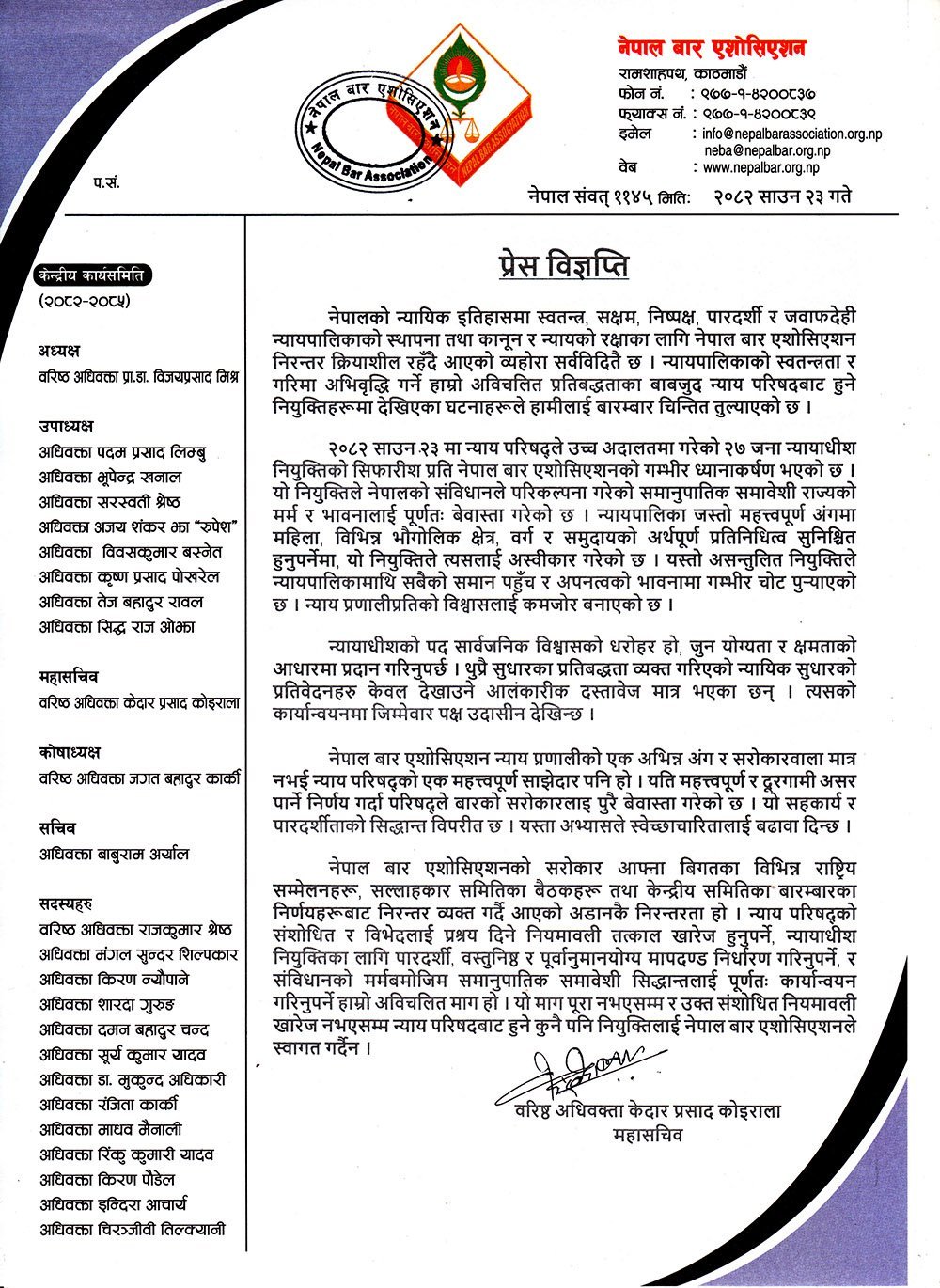 काठमाडौं । उच्च अदालतमा २७ जना न्यायाधीश नियुक्ति सिफारिसप्रति नेपाल बार एसोसिएसनले असन्तुष्टि व्यक्त गरेको छ । शुक्रबार विज्ञप्ति जारी गरी बारले न्यायाधीश नियुक्ति सिफारिसप्रति असन्तुष्टि व्यक्त गरेको हो ।