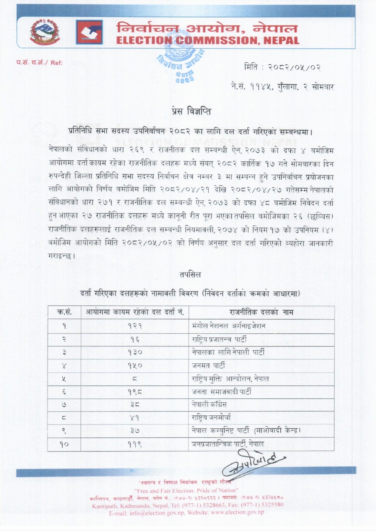 काठमाडौं । रुपन्देही–३ मा हुने प्रतिनिधिसभा सदस्यको उपनिर्वाचन लागि २६ दल दर्ता भएका छन् । निर्वाचन आयोगले सोमबार विज्ञप्ति जारी गरी २७ वटा दलले निवेदन दिएकामा २६ दल मात्रै दर्ता हुन योग्य रहेको बताएको हो । रुपन्देही–३ मा मंसिर १७ गते उपनिर्वाचन हुँदैछ।