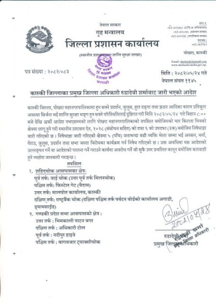 गण्डकी । जिल्ला प्रशासन कार्यालय कास्कीले आज बिहान ८ बजेदेखि अर्को आदेश नभएसम्मका लागि जनाउँदै जिल्लाका विभिन्न स्थानमा निषेधाज्ञा जारी गरेको छ ।