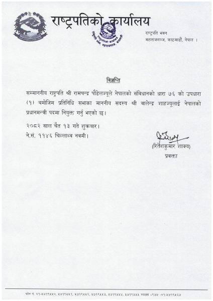 काठमाडौं । राष्ट्रिय स्वतन्त्र पार्टी (रास्वपा)का वरिष्ठ नेता बालेन साह प्रधानमन्त्री नियुक्त भएका छन् । शुक्रबार बिहान राष्ट्रपति रामचन्द्र पौडेलले साहलाई प्रधानमन्त्री नियुक्त गरेका हुन् । उनी नेपालको ४७ औं प्रधानमन्त्री बनेका छन् ।