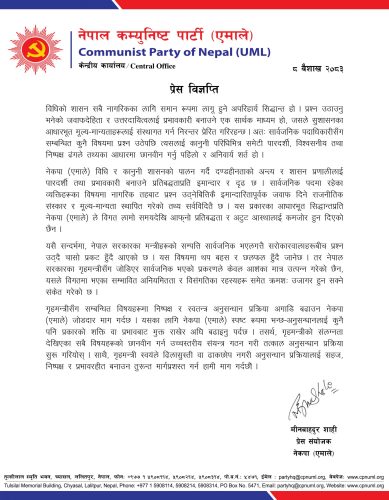 मंगलबार एमाले प्रचार विभाग प्रमुख मीनबहादुर शाहीले विज्ञप्ति जारी गरी अनुसन्धानलाई कुनै पनि प्रकारको शक्ति वा प्रभावबाट मुक्त राखेर अघि बढाउन माग गरेका हुन् ।