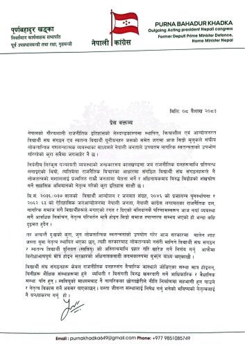 मंगलबर विज्ञप्ति जारी गर्दै खड्काले सरकारबाट लोकतन्त्रको नर्सरी मानिने विद्यार्थी संघसंगठन र स्ववियुको अस्तित्वमाथि प्रहार गरी खारेज गर्ने निर्णय गर्नु आफैमा विरोधाभाषपूर्ण भएको बताएका हुन् ।