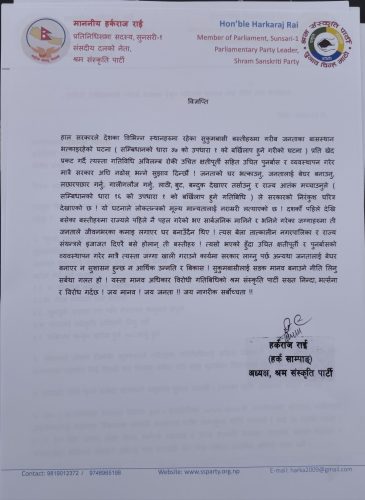 विज्ञप्तिमा भनिएको छ, ‘हाल सरकारले देशका विभिन्न स्थानहरुमा रहेका सुकुम्बासी बस्तीहरुमा गरीब जनताका बासस्थान भत्काइरहेको घटना (संविधानको धारा ३७ को उपधारा १ को बर्खिलाप हुनेगरीको घटना) प्रति खेद प्रकट गर्दै त्यस्ता गतिविधि अविलम्ब रोकी उचित क्षतिपूर्तिसहित उचित पुनर्बास र व्यवस्थापन गरेर मात्रै सरकार अघि बढोस् भन्ने सुझाव दिन्छौं ।’